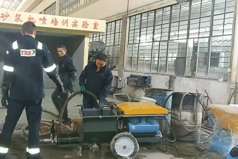 世界著名化工巨擎德国TRB公司工程技术人员Johannes在“温工”砂浆机喷涂实验室作设备应用试验